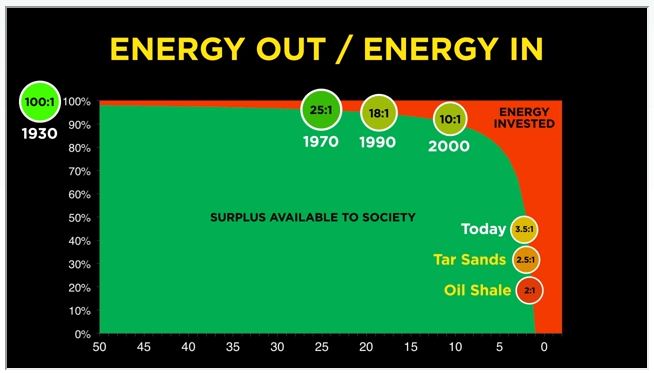 Benoît Thévard, expert indépendant en énergie – ancien élève de l’école des Mines d’Alès – nous apprend qu’au début de notre grande soif de pétrole, il suffisait de « dépenser » un baril pour en extraire 100. Peu d’efforts, donc d’énergie, étaient nécessaires. Aujourd’hui, pour un baril investi, nous en extrayons moins de 10. Quant aux agrocarburants, joliment baptisés « biocarburants » et considérés il n’y a pas si longtemps comme une « piste d’avenir », nécessitent 1 baril de pétrole pour en produire 1. Autrement dit l’homme est bien moins efficace que Mère Nature (et son acolyte Chronos). Un jeu à somme nul, et encore faudrait-il décompter les conséquences sur le marché alimentaire et l’éventuelle déforestation induite. Quant aux sables bitumineux, ils affichent un rendement net de 1 baril consommé pour 3 à 4 barils produits seulement. Peut mieux faire !